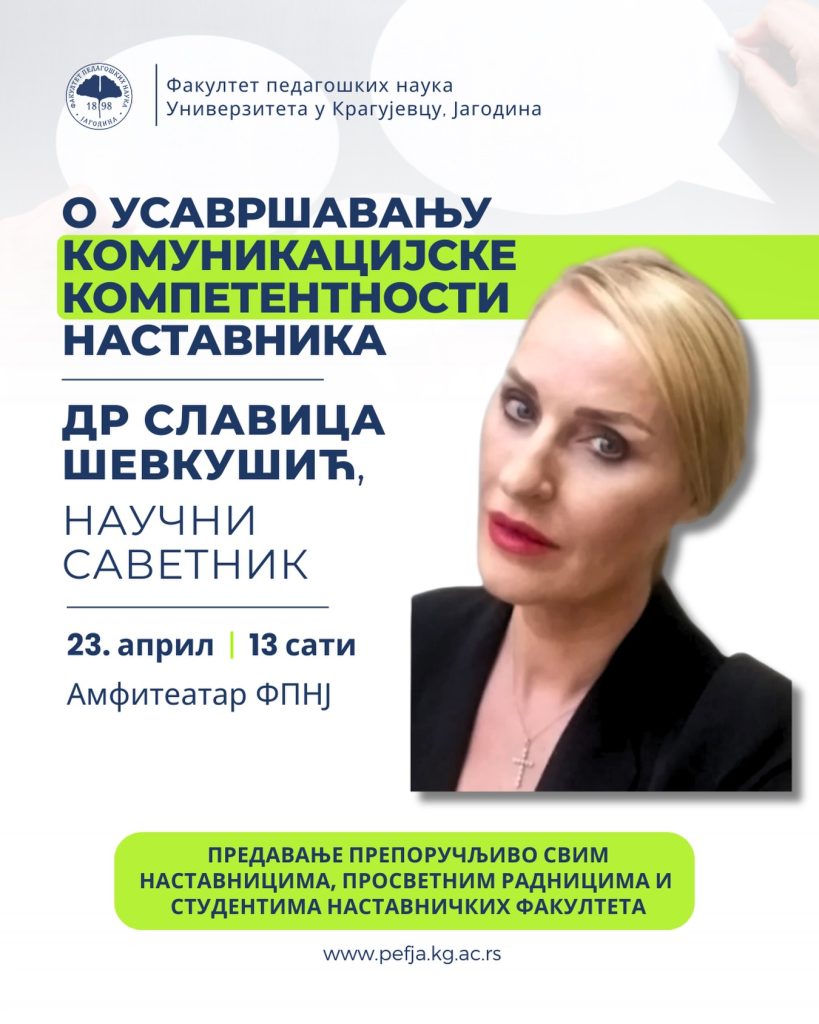 Факултет педагошких наука у Јагодини организује предавање на тему унапређења комуникацијске компетентности наставника, које ће одржати др Славица Шевкушић, научни саветник.